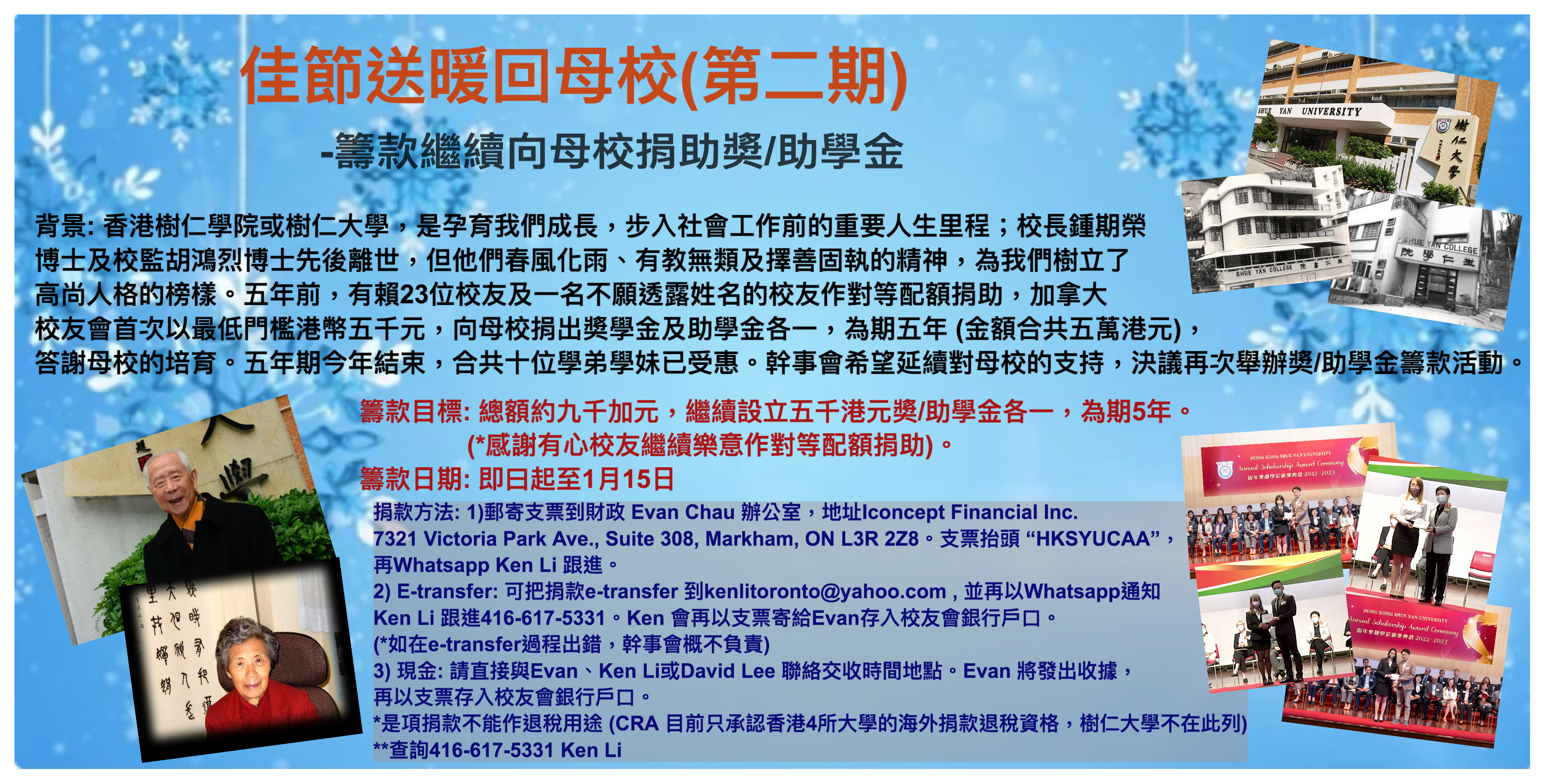 🎄🎄聖誕新年臨近,是一個充滿感恩與分享的溫暖時節。回顧我們在樹仁校園中的成長歲月,母校不僅是知識的搖籃,更是塑造我們品格與夢想的起點。我們尤其懷念已故的校長鍾期榮博士及校監胡鴻烈博士,他們一生無私奉獻,以春風化雨般的關愛,守護著每一屆學生的成長。他們的教育理念—「敦仁博物」,至今仍深深烙印在我們的心坎中。雖然他們已離我們而去,但他們的精神與理想從未消逝。我們相信,最好的紀念方式,就是將他們的辦學初心延續下去,透過設立獎/助學金,支持那些才華洋溢卻資源有限的年輕校友,讓他們得以專注學業、不因經濟壓力而放棄未來。5年前我們首次以樹仁大學加拿大校友會名義,設立獎/助學金各一,至今十名學弟妹受惠。5年過去,我們希望以行動繼續回饋母校,誠摯邀請您加入「第二期獎助學金捐贈計劃」,幫助年輕學弟學妹們追逐夢想,讓母校的培育精神薪火相傳。